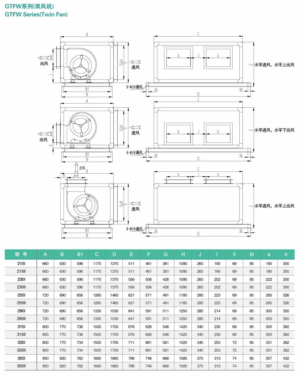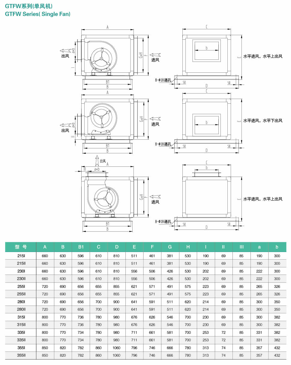 概述: 風(fēng)機(jī)箱采用鋁合金框架夾芯板結(jié)構(gòu),機(jī)外減振形式,整體堅(jiān)固、新穎美觀、體積小,方便運(yùn)輸安裝;運(yùn)行高效穩(wěn)定,噪聲低。適用于工礦企業(yè)、商場(chǎng)、賓館及一般建筑物的通風(fēng)換氣。其中GTFB、GTFH系列可用于消防排煙系統(tǒng)(電機(jī)置于箱體外),擁有國(guó)家消防排煙許可認(rèn)證。同時(shí)該系列配套的風(fēng)機(jī)系列獲得了加蓋AMCA印章的授權(quán)。 特殊選項(xiàng): 1. 靜音風(fēng)機(jī)箱: 面板內(nèi)側(cè)增加孔板、玻璃棉,可降噪音6~8dB。 2. 超靜音風(fēng)機(jī)箱: 孔板穿透率33%,面板總厚度達(dá)到50mm;機(jī)內(nèi)出風(fēng)口消聲, 可降噪音12~16dB;外形段長(zhǎng)及寬度尺寸相應(yīng)增加。 3. 可非標(biāo)設(shè)計(jì)機(jī)內(nèi)減振結(jié)構(gòu)。